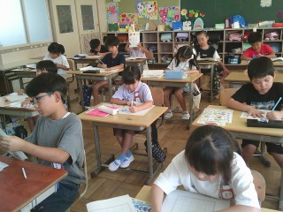 国語で学習した「スイミー」の一部を書きました。書写コンクールに向け、マスの中心に描くことに心がけました。