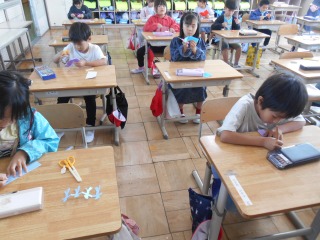 「ちょきちょきかざり」という単元です。折り紙を折り、切って開いた形を想像しながら、はさみを入れていました。