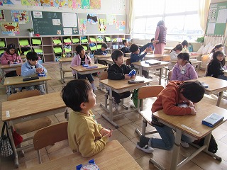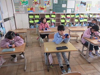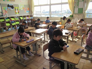 1年1組では、時計の模型を使い、時間の学習をしていました。