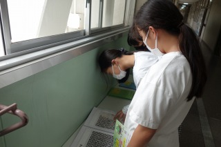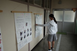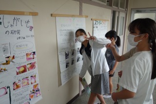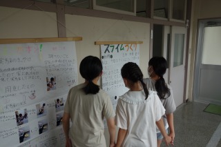 会議室の前に、朝礼で表彰を受けた理科作品が展示されています。どれも力作で、見に来た子たちが感心していました。