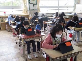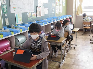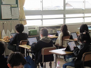 2年1組では、タブレットを使い、復習問題にチャレンジしていました。