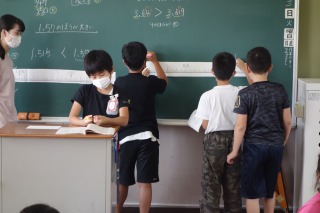 4年1組の算数は、小数の大きさの比べ方を考える学習でした。大きな数直線の図を使って、みんなで考えました。
