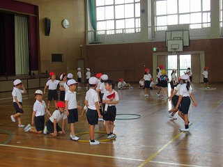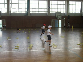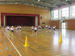 2年生は体育館で、障害物を飛びこえて走る運動を行っていました。