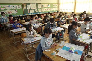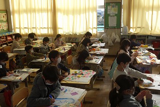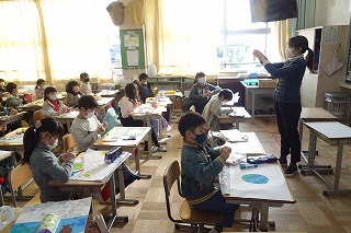 2年1組の図画工作は、「わくわくすごろく」を作りました。コースや飾りを貼り付けながら作りました。