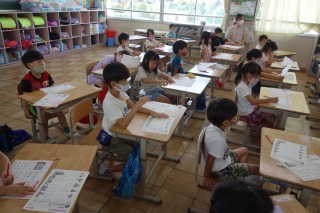 1年1組の国語は、テストの解説でした。文を書くときの、「は」と「わ」の違いや、「を」と「お」の違いの説明を聞きました。