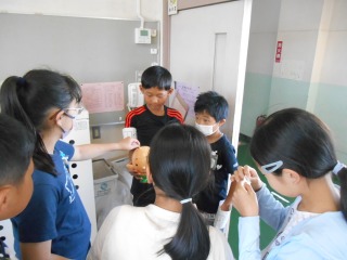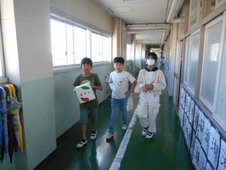 朝、緑の募金の呼びかけをするために、児童会役員と環境委員会が各教室を回っています。