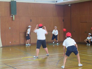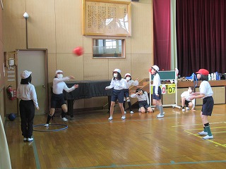 5年1組は体育の時間でした。ベースボール型の単元で、ハンドベースボールを行っていました。自分が狙ったところに飛ばすことはできたかな?