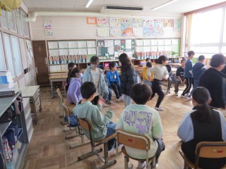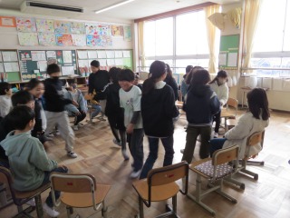 「椅子とりゲーム」を楽しんでいました。クラスの友達とさらに仲よくなるチャンスですね。