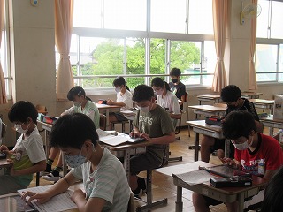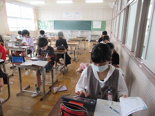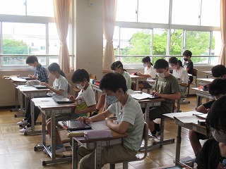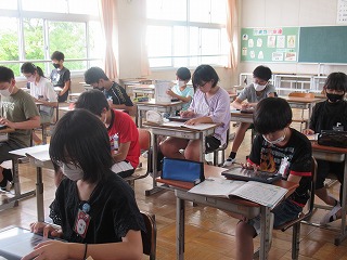 6年1組が、音楽室で音楽の授業を行っていました。タブレットを鍵盤を使い、演奏をしていました。