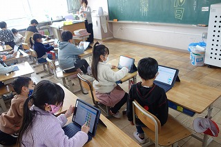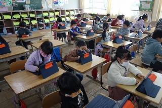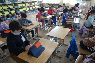 1年2組の学級活動では、タブレット端末のEライブラリーの練習問題に取り組みました。