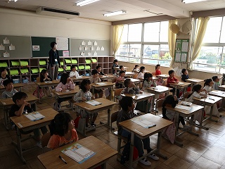 みんな、とてもよで生活科のワークシートの書き方を聞いていました。