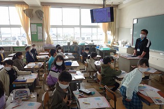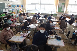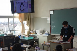 3年2組の理科は、植物のつくりの復習でした。モニター画面を見ながら、復習プリントの内容確認をしました。