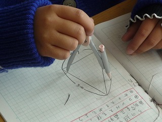 コンパスや定規を使って、二等辺三角形をかきました。