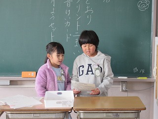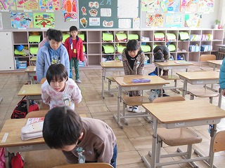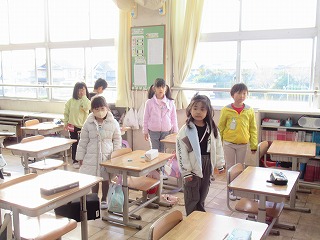 1年1組では、日直さんが司会をして朝の会が進められていました。朝の挨拶をしているところでした。