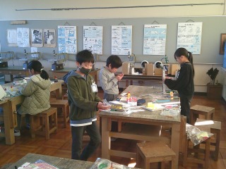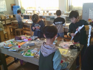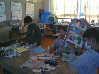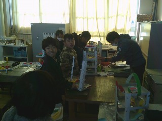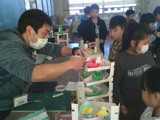 ビー玉を転がすタワーが1番上の段まで到達していました。角を先生にステイプラーで留めてもらい、完成に近づいていました。