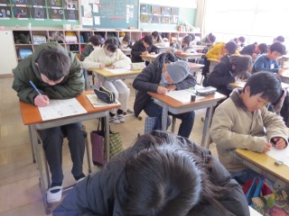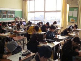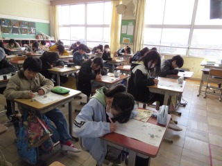 毛筆で書いた「書き初め」を振り返りました。字間や地の大きさに気をつけたり、次の画の試筆につなげたり、これまで学習したことを全て使って書きました。