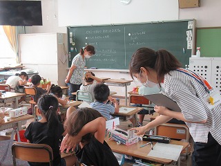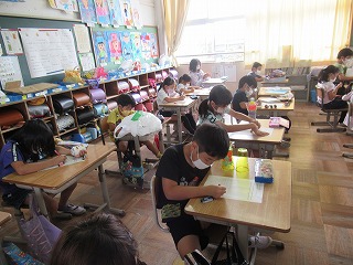 2年1組では、生活科の授業が行われていました。自分がつくったおもちゃについて、プリントにまとめていきます。みんなしっかり取り組んでいました。