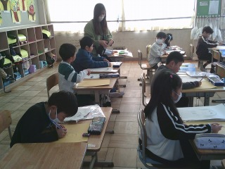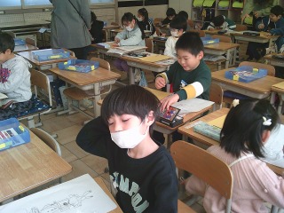 版画に取り組んでいました。下書きを完成させ、本番の用紙に書き写しているところでした。