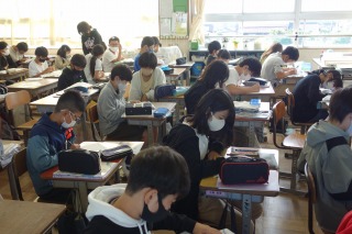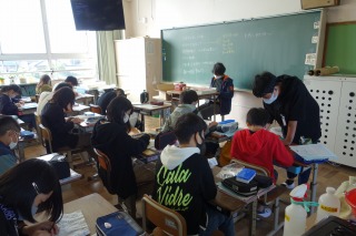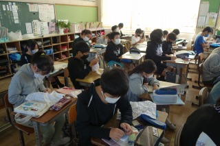 6年1組の家庭科では、お弁当の日の説明を聞きました。その後で、裁縫の実習に取り組みました。
