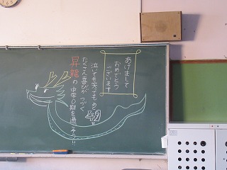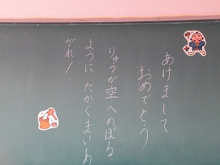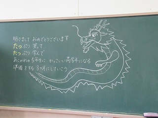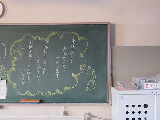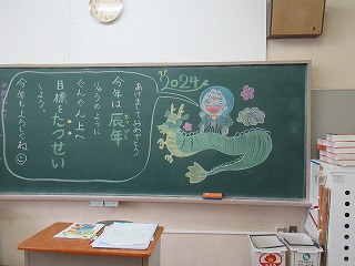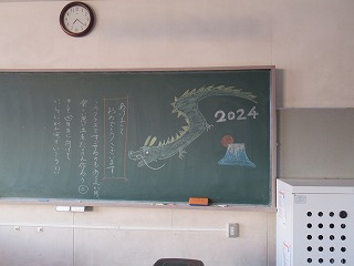 今日からいよいよ2024年の学校生活のスタートです。黒板には、先生方からのメッセージが書かれている教室もみられました。今年もがんばりましょう。