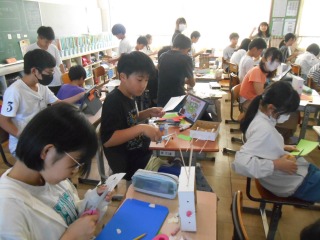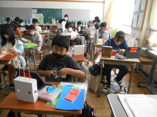 箱の上に3本の棒が出ていました。その棒が上下する仕組みになっていました。何をつけるかもう考えてあるようです。どんな動きをさせるのか、楽しみです。