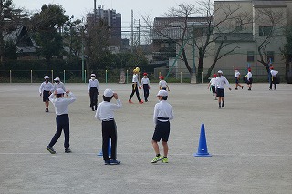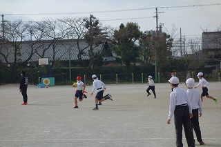 5年2組の体育は、タグラグビーの練習でした。3対3の実戦的なパス練習をしました。