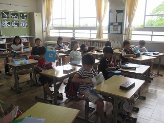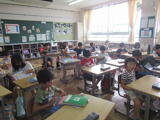 2年1組では、算数の時間、文章問題の意味をしっかりきいているところでした。ノートを準備し、問題に取り組みます。