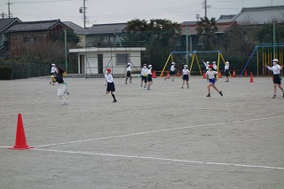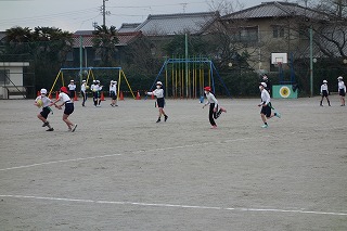 5年1組の体育は、「タグラグビー」の練習でした。チームに分かれて対戦式のパス練習を行いました。