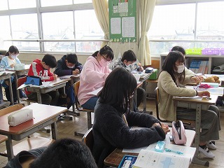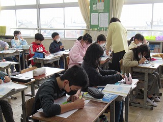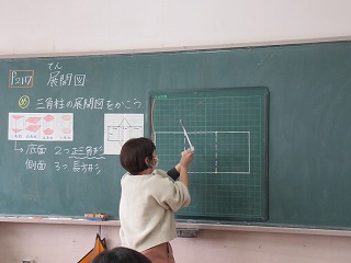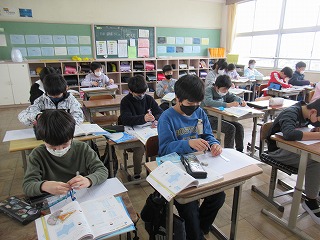 5年1組では、算数の授業が行われていました。コンパスを使い、図を描いていました。