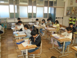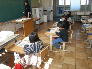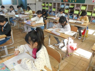 「はたらくくるま」の説明文を書き、ワークシートの上にイラストを描いていました。クーピーを使い、上手に描いていました。