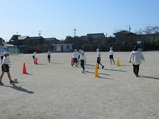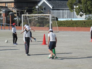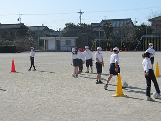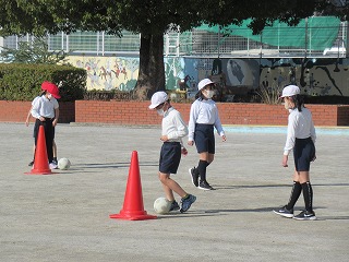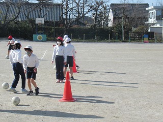 4年1組が、運動場で体育をしていました。ボールをけってパスしながら、動いていきます。暖かい春の日差しを感じました。