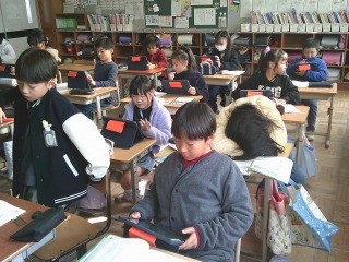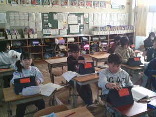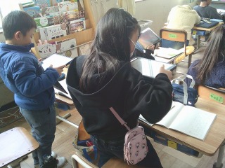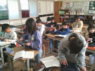 俳句の学習をしていました。教科書の単価を写真に撮り、タブレットの画面上で五七五が分かるように斜線を引いていました。