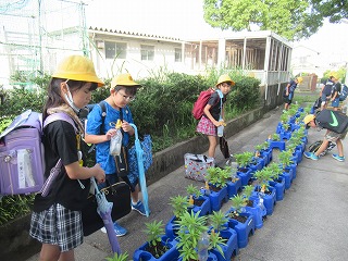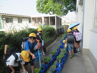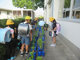 3年生がホウセンカを育てています。朝の水やりをしていました。子どもたちはホウセンカの成長をしっかり見守っています。