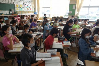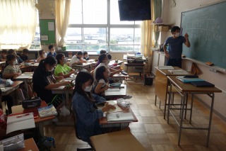 5年2組の算数は、公倍数の学習でした。黒板に表を書いて、みんなで公倍数を確認しました。