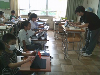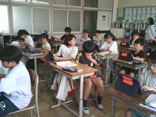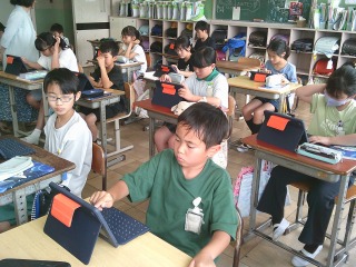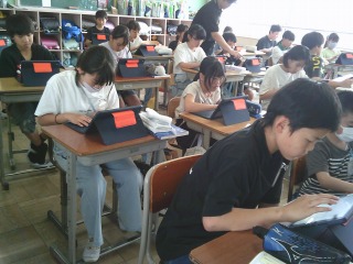 スピーチについての学習です。「聞く」に注目し、どう話すと聞いてもらえるのかを考え、タブレットに入力していました。
