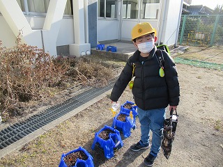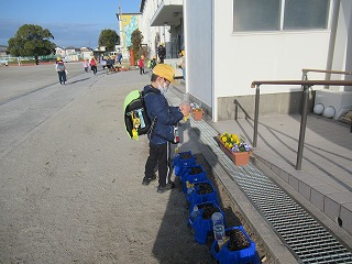 1年生の子が、登校してすぐ、チューリップの鉢植えに水やりをしていました。