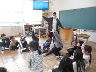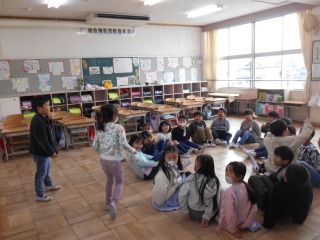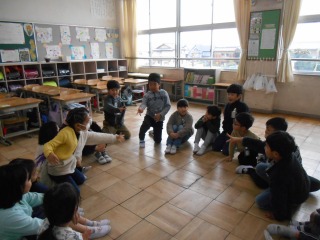 お楽しみ会でした。ルールを確認し、「ハンカチ落とし」が始まりました。