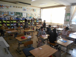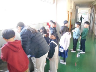 図書室で冬休みに借りる本を探した後、教室へ入る前に石鹸でしっかりと手洗いをしていました。手洗い授業で学んだことを思い出しながら、洗っていました。