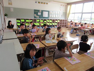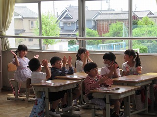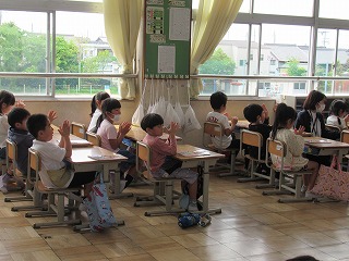 1年1組は音楽の時間でした。音楽を聴きながら、曲の調子に合わせて、手拍子の大きさを大きくしたり小さくしたり、工夫していました。