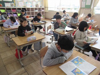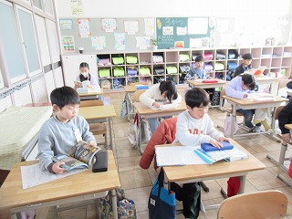 1年2組では、朝の時間、読書をしたり、自由帳に絵を描いたりして過ごしていました。