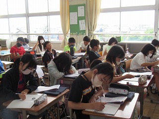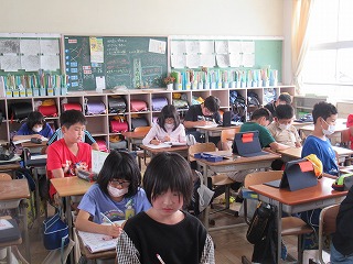 5年1組では、算数の学習が行われていました。計算ドリルを使い、問題を解いていきます。難しい学習内容です。しっかり身につけてくださいね。