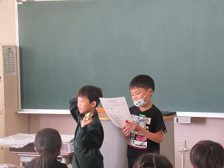 2年2組では、朝の会の時間、日直さんが前に出て朝の会が行われていました。
