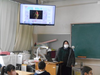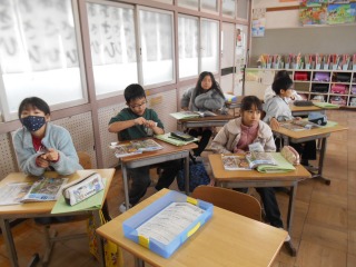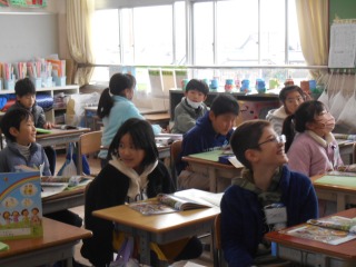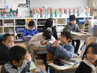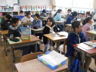 動物の写真を見ながら、近いもの矢遠いものを指すときの言い方、聞き方と答え方を練習していました。