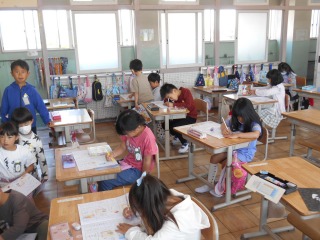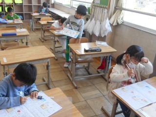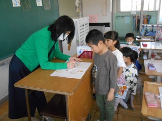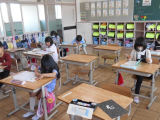 ひらがなの練習をしていました。はねやはらいを気にしながら、丁寧に書き、先生に見てもらっていました。