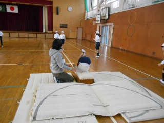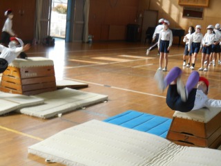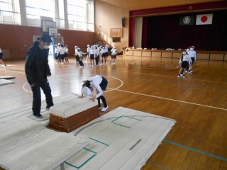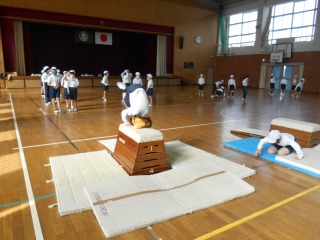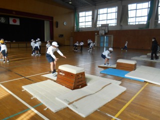 台上前転をした後、ポーズを決める練習をしていました。きれいに演技できていました。