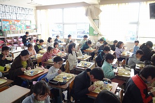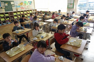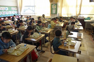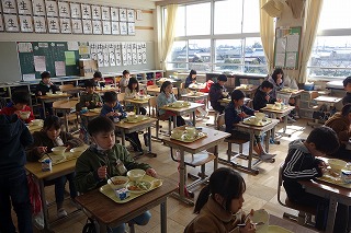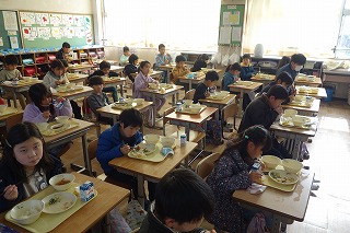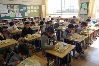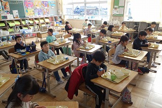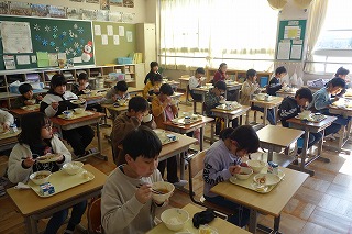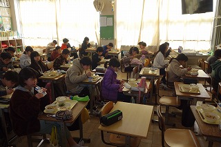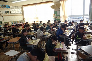 給食の時間には、どの教室も、同じ方向を向いて默食をしています。