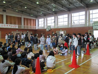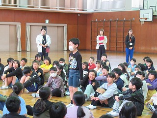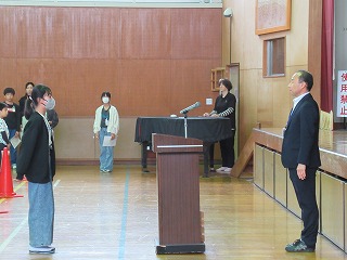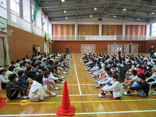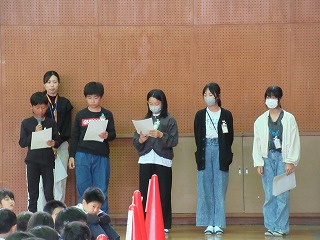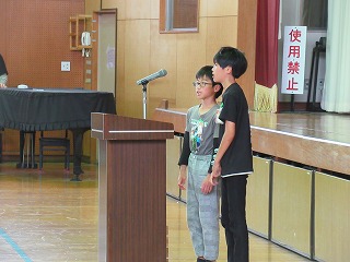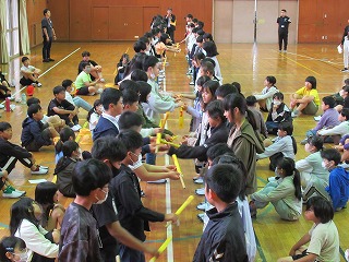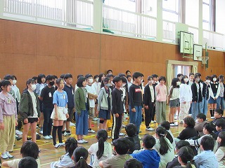 本日の朝礼では、朝のあいさつ、校長先生の話、生活委員会の連絡のあと、今週木曜・金曜で修学旅行に出かける6年生に向けて、いってらっしゃいの会を行いました。通学班や委員会の仕事を任せてくださいと5年生の代表が立派にあいさつをして、2~5年生の代表児童が6年生から通学班の班長棒を受け取っていました。