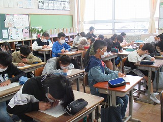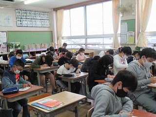 6年1組では、漢字テストが行われていました。みんな真剣に取り組んでいました。