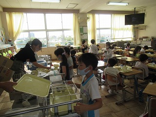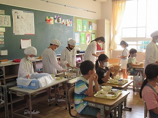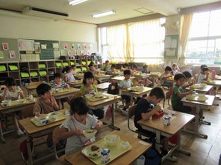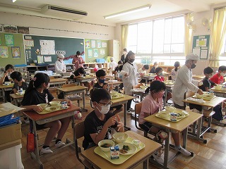 給食の準備や給食中のようすです。みんな静かに食べていて、感心です。