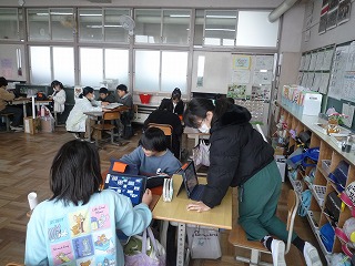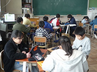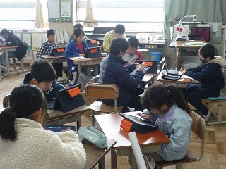 グループごとに愛知県の農業や工業、祭りなどをタブレットを活用して調べました。